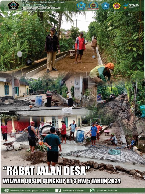 Selasa 23 AprilĀ 2024, Dusun Cungkup RT 3 RW 5 Desa Bacem, Bersama Kepala Desa beserta TPK Desa Bacem memulai Pembangunan Rabat Jalan Desa yang sudah direncanakan dalam RPJM Desa Bacem. Dikarenakan sudah lama jalan gang yang menjadi akses ekonomi masyarakat lingkungan rusak dan ketika hujan turun sulit untuk diakses sehingga pemerintah desa ditahun 2024 mulai bisa melakukan perbaikan dengan cara pengerasan dengan cor semoga dengan dibangunnya jalan ini bisa meningkatkan perekonomian masyarakat sekitar.